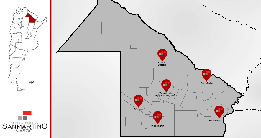 Actuamos en la totalidad del territorio de la Provincia de Chaco. Judicialmente litigamos tanto en la ciudad de Resistencia como en los fueros ubicados en las ciudades de: Presidencia Roque Saenz Peña, Villa Angela, Charata, Juan J. Castelli y San Martin